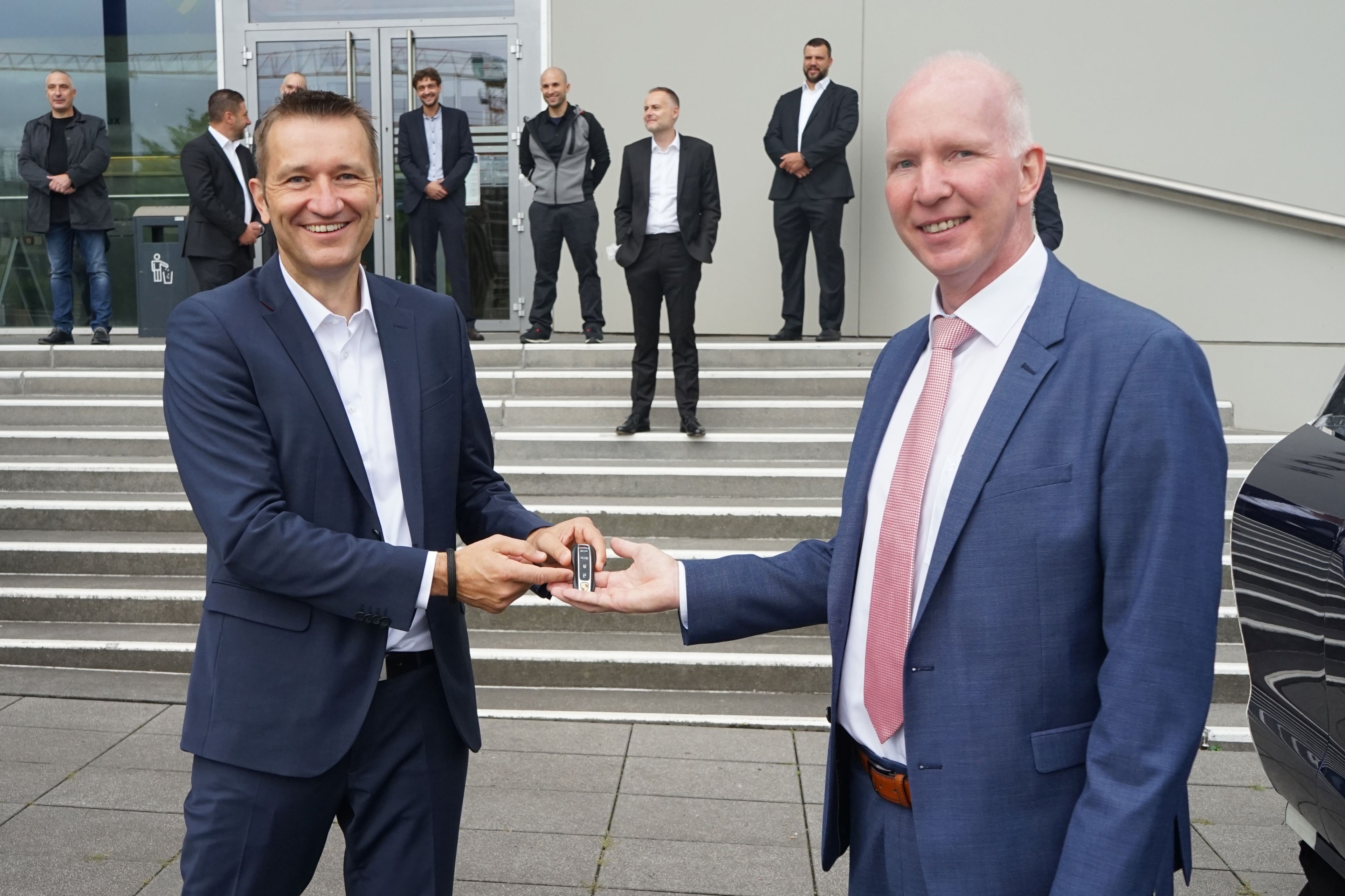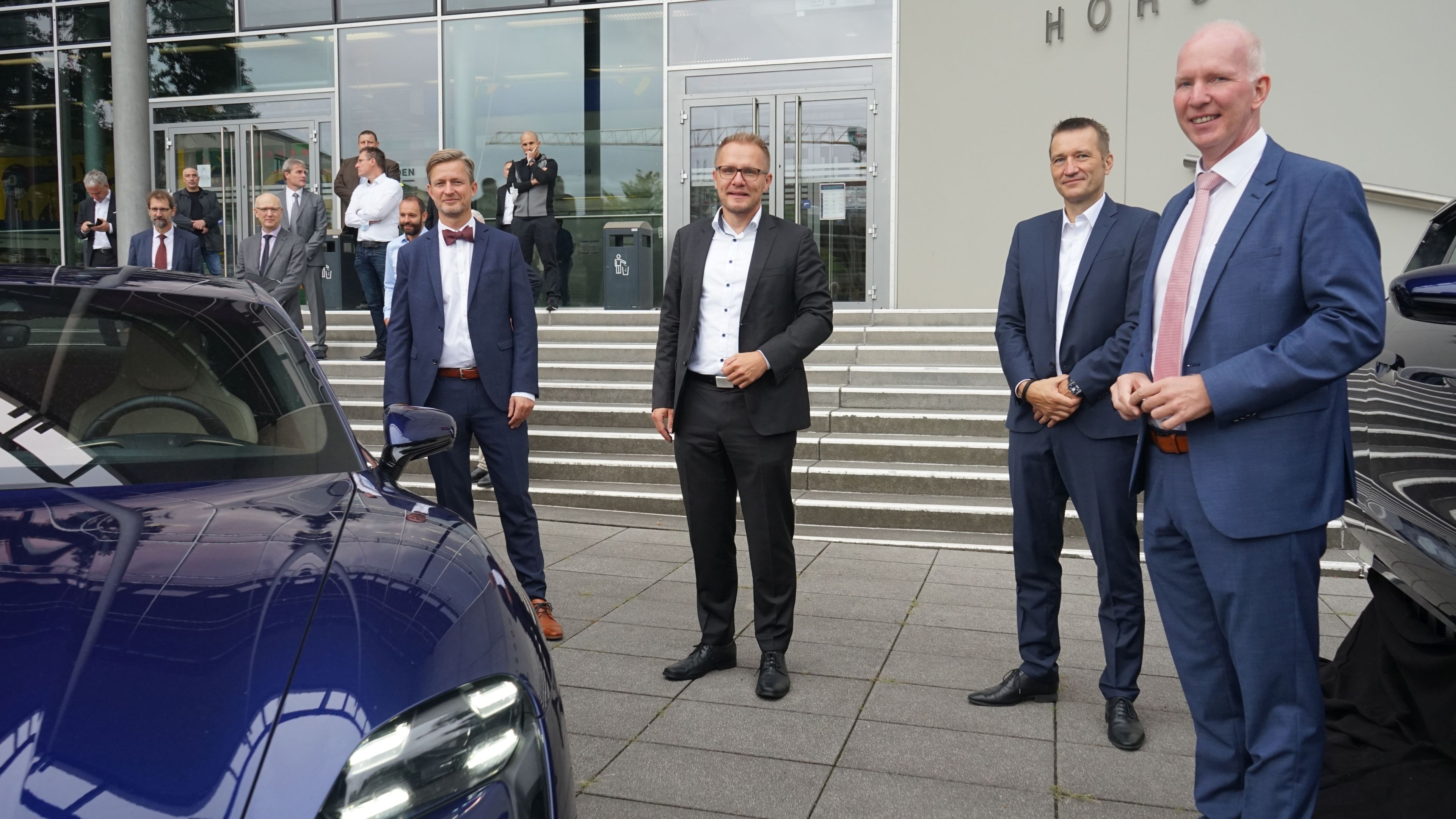A group of people stand in front of a building, along with a Porsche and a car cockpit.