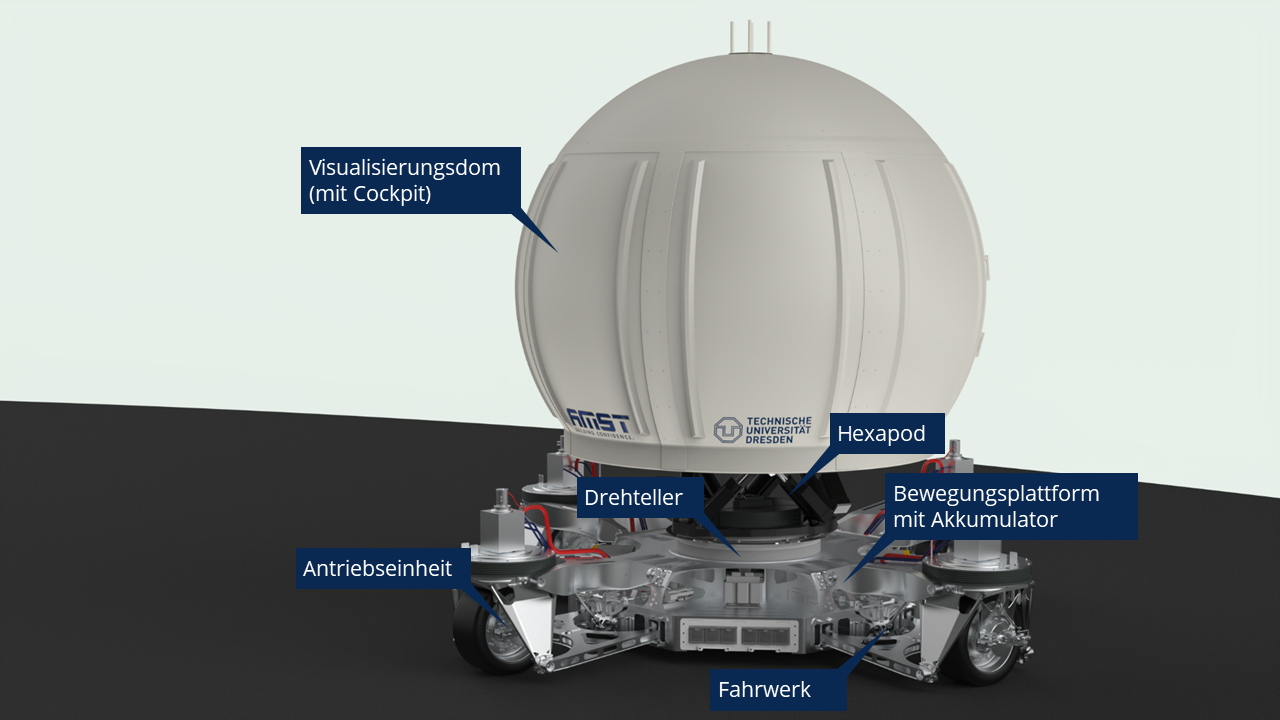 Danach wurde das System wieder zerlegt und der Dome inkl. des Mockups an die TU Dresden geliefert. Hier wird der Simulator im reduzierten Umfang zunächst als statisches System eingesetzt. Die Forschenden der TU Dresden rund um Prof. Günther Prokop (Leiter Professur für Kraftsfahrzeugtechnik) und Dr. Thomas Tüschen werden an dem visuellen Anzeigesystem und der Integration des Modells arbeiten. Parallel hierzu werden bei der AMST die letzten Arbeiten an der Bewegungsplattform und an der Kontrollstation abgeschlossen. Die „Wiedervermählung“ von Dome und Bewegungsplattform wird für das 3. Quartal dieses Jahres an der TU angepeilt. Anschließend erfolgt die Inbetriebnahme des Gesamtsystems