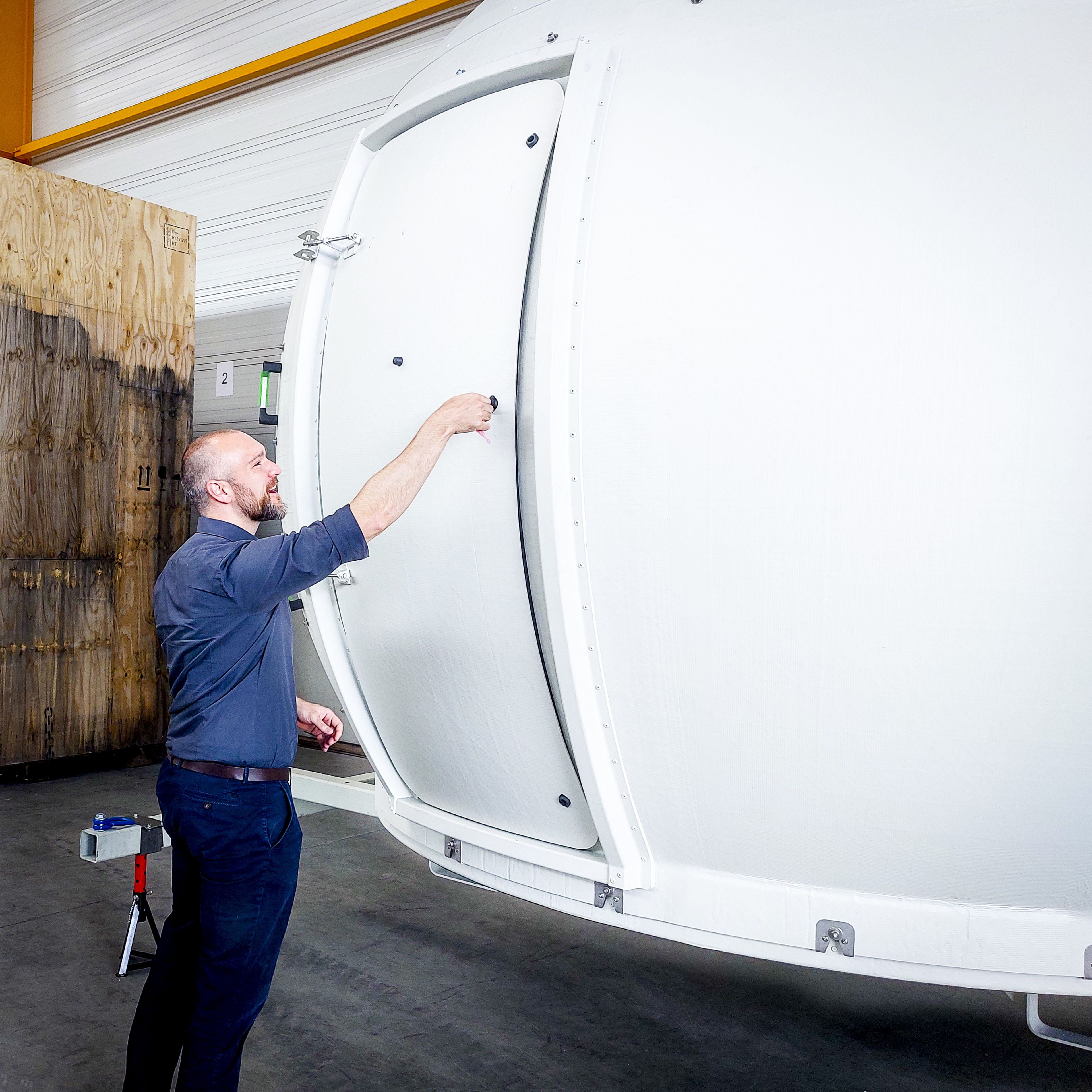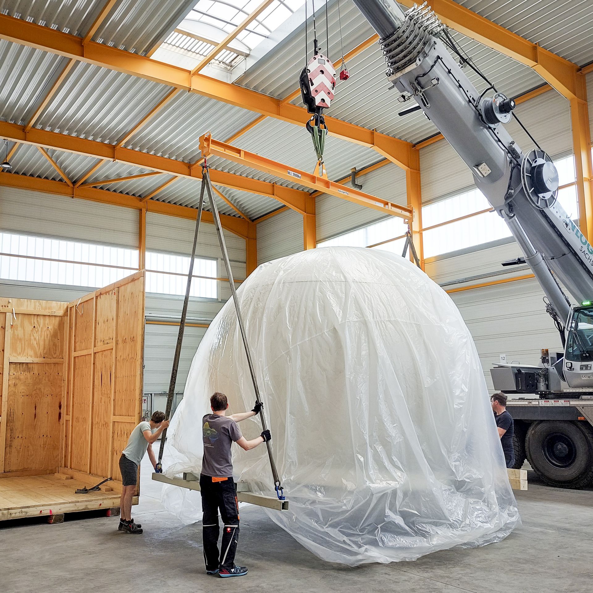 An der TU Dresden wird gemeinsam mit externen Partnern ein weltweit einzigartiger hochimmersiver Fahrsimulator zum szenarienbasierten Testen automatisierter Fahrfunktionen und für die optimale Mensch-Maschine-Interaktion entwickelt (siehe Bericht vom 12.10.21). Kürzlich wurde im Projekt ein wichtiger Meilenstein erreicht: Die bei unterschiedlichen Projektpartnern gefertigten Hauptkomponenten des Systems – Bewegungsplattform, Hexapod, Projektions-Dome und Cockpit-Mockup – befanden sich erstmals gemeinsam an einem Ort, und zwar beim Projektpartner AMST Systemtechnik GmbH in in Ranshofen/Österreich. Kurz nach der „Hochzeit“ erfolgte jedoch schon wieder die Trennung: Projektions-Dome und Cockpit-Mockup wurden verpackt (Maße der Kiste: 4,18 m breit, 4,33 m hoch) und per Spezialtransport nach Sachsen an die TU Dresden transportiert.