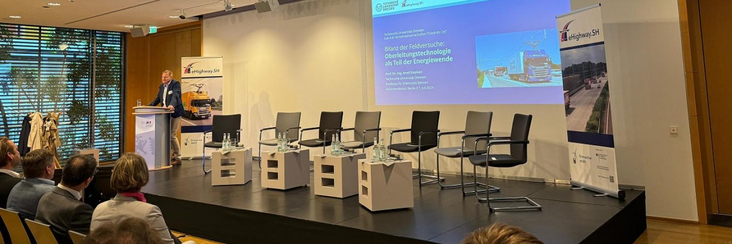 Am 1. Juli 2024 wurde seitens des Ministeriums für Energiewende, Klimaschutz, Umwelt und Natur (MEKUN) sowie des Ministeriums für Wirtschaft, Verkehr, Arbeit, Technologie und Tourismus (MWVATT) des Landes Schleswig-Holstein unter Beteiligung der Fakultät Verkehrswissenschaften ein politisches Event mit Ergebnispräsentationen aus dem Feldversuch sowie einer Podiumsdiskussion zu den Zukunftsperspektiven der Oberleitungstechnologie in der Landesvertretung SH beim Bund in Berlin organisiert. Auch Vertreter:innen aus der Landes- und Bundespolitik sowie aus Wirtschaft und Logistik waren vertreten.