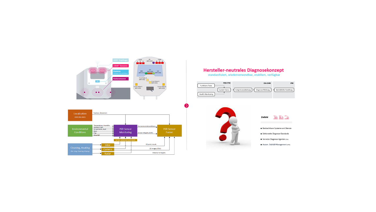 Im Rahmen des Projektes trägt die Professur für Fahrzeugmechatronik der TU Dresden zur diagnostischen Absicherung des Umfelderfassungssystems (Perception-Train-Front-Monitor; PER-TFM) bei. Hierbei planen die Verkehrsforschenden Methoden der prädiktiven Fehlererkennung exemplarisch für betrieblich relevante, komplexe Fehlerfälle des PER-TFM Systems, bestehend aus Lidar-, Radar- und Kamera-Sensorik, umzusetzen. In einem ersten Schritt werden Algorithmen umgesetzt, mit denen sich komponentenspezifische Gesundheitszustände (State of Health; SOH) schätzen lassen. Aufbauend darauf, werden die Wissenschaftler:innen der TU Dresden Gesundheitsmonitore für die Funktionen des Gesamtsystems PER-TFM ableiten. Gesundheitsmonitore geben Auskunft darüber, zu welchem Grad bei degradierten Systemkomponenten (z. B. verschmutzte Sensoren, witterungsbedingte Einflüsse, Defekte etc.) unter definierten betrieblichen Randbedingungen eine Systemfunktion noch erfüllt werden kann. Die Gesundheitsmonitore sind Eingabe eines Fehlermanagementsystems und können beispielsweise eine Sensorreinigung im nächsten Bahnhof oder die Fahrt mit reduzierter Geschwindigkeit veranlassen.