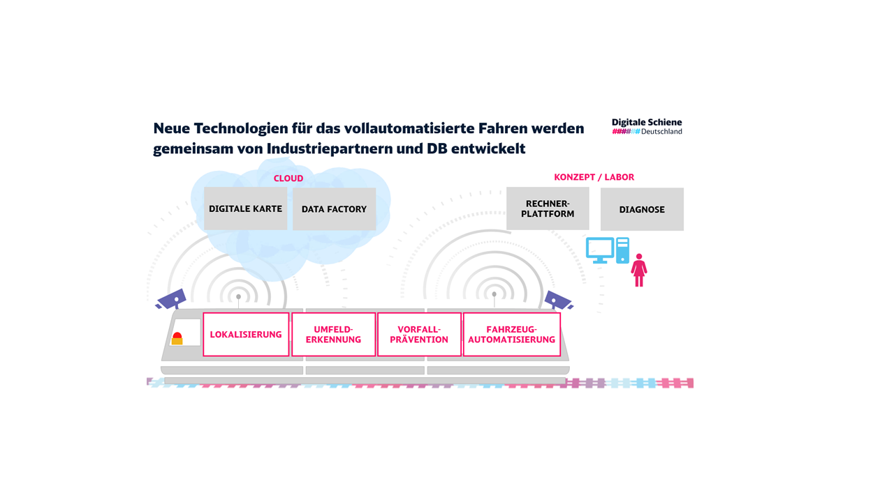 Im Rahmen des Vorhabens AutomatedTrain sollen wesentliche technologische Lösungsansätze für die Umsetzung des vollautomatisierten Fahrens auf Haupt- und Nebenbahnen (sog. ATO GoA4) in einem Verbundvorhaben durch Industrie, Eisenbahnverkehrsunternehmen, Infrastrukturbetreiber und Forschungseinrichtungen erarbeitet und demonstriert werden. Im Fokus stehen dabei drei Aspekte: