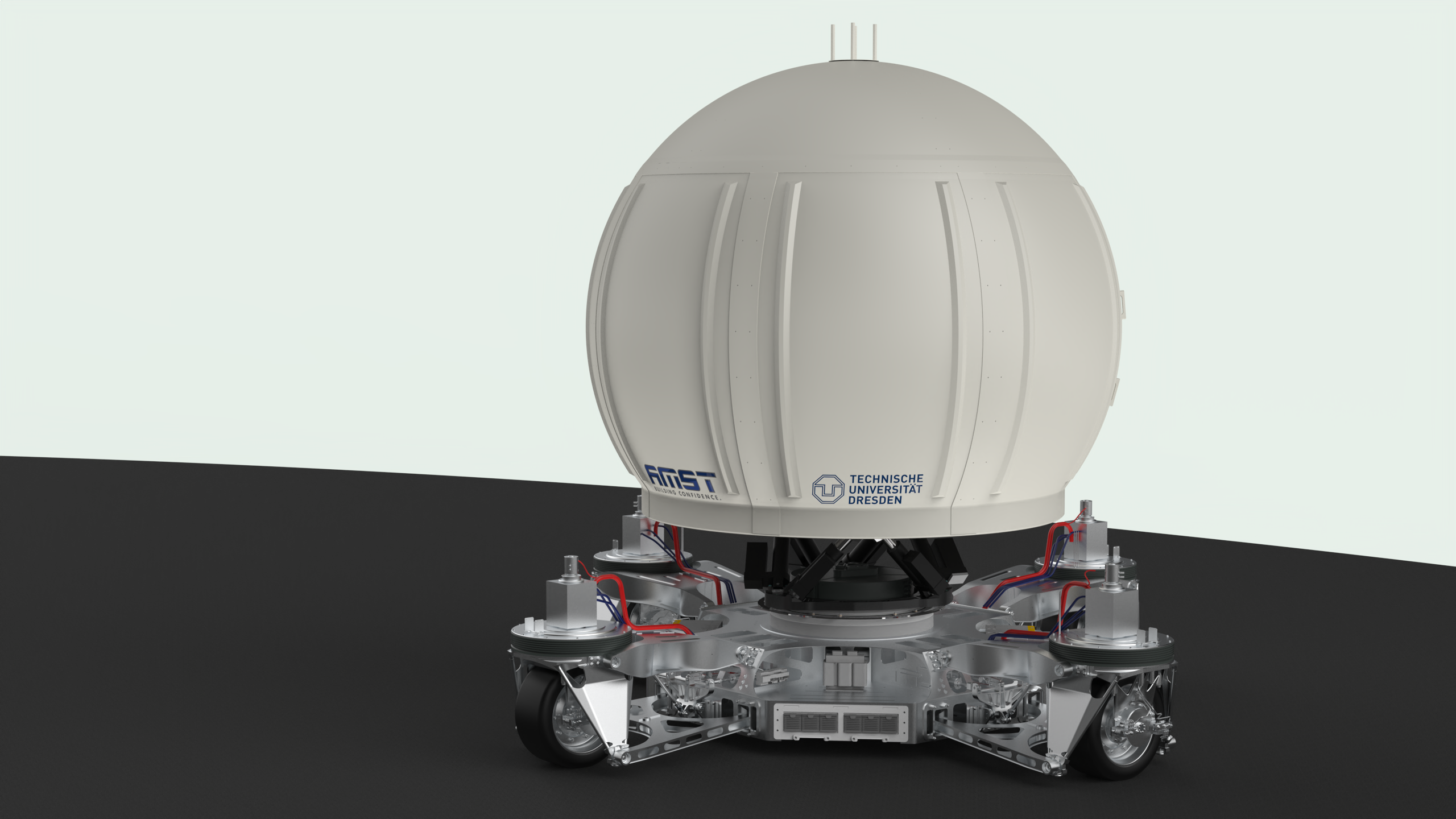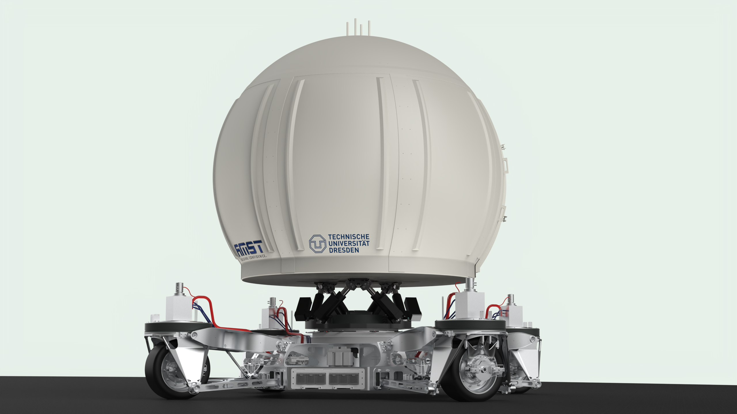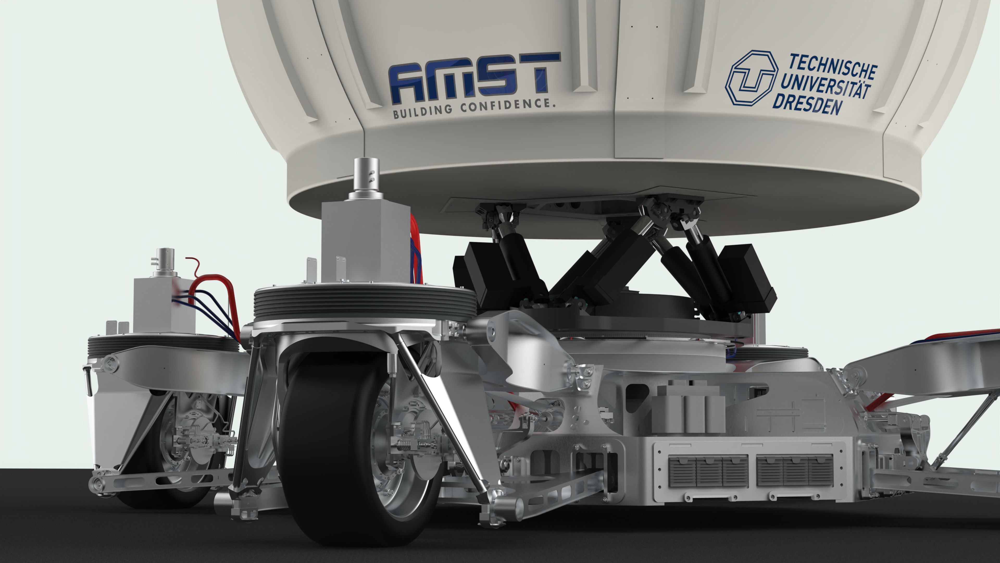 Wer die Abbildungen des 5x5x5 Meter messenden Fahrsimulators der TU Dresden mit anderen Fahrsimulatoren weltweit vergleicht, dem fallen die Reifen und verschiedenen Bewegungsachsen auf. Durch die Räder kann sich der Fahrsimulator auf einer Bewegungsfläche von 70x70 Metern bei entsprechenden trockenen Wetterbedingungen in alle Richtungen bewegen. Dazu erklärt Herbert Pinwinkler, Projektleiter auf Seiten der AMST: „Der Fahrsimulator bewegt sich mit seinen 10 Bewegungsfreiheitsgraden frei auf der Ebene und ist im Gegensatz zu den meisten anderen Simulatoren kein gebundenes, auf Schienen montiertes System.“ Er betont, worauf es beim hochimmersiven Fahrsimulator ankommt: „Eine ausgeklügelte sowie performante Leichtbauweise und Bewegungssteuerung verbunden mit einer realitätsnahen virtuellen Außensicht sollen Sinneseindrücke vermitteln, die von denen im Fahrzeug nicht zu unterscheiden sind. So kann der Fahrer ganz in die Simulation eintauchen.“