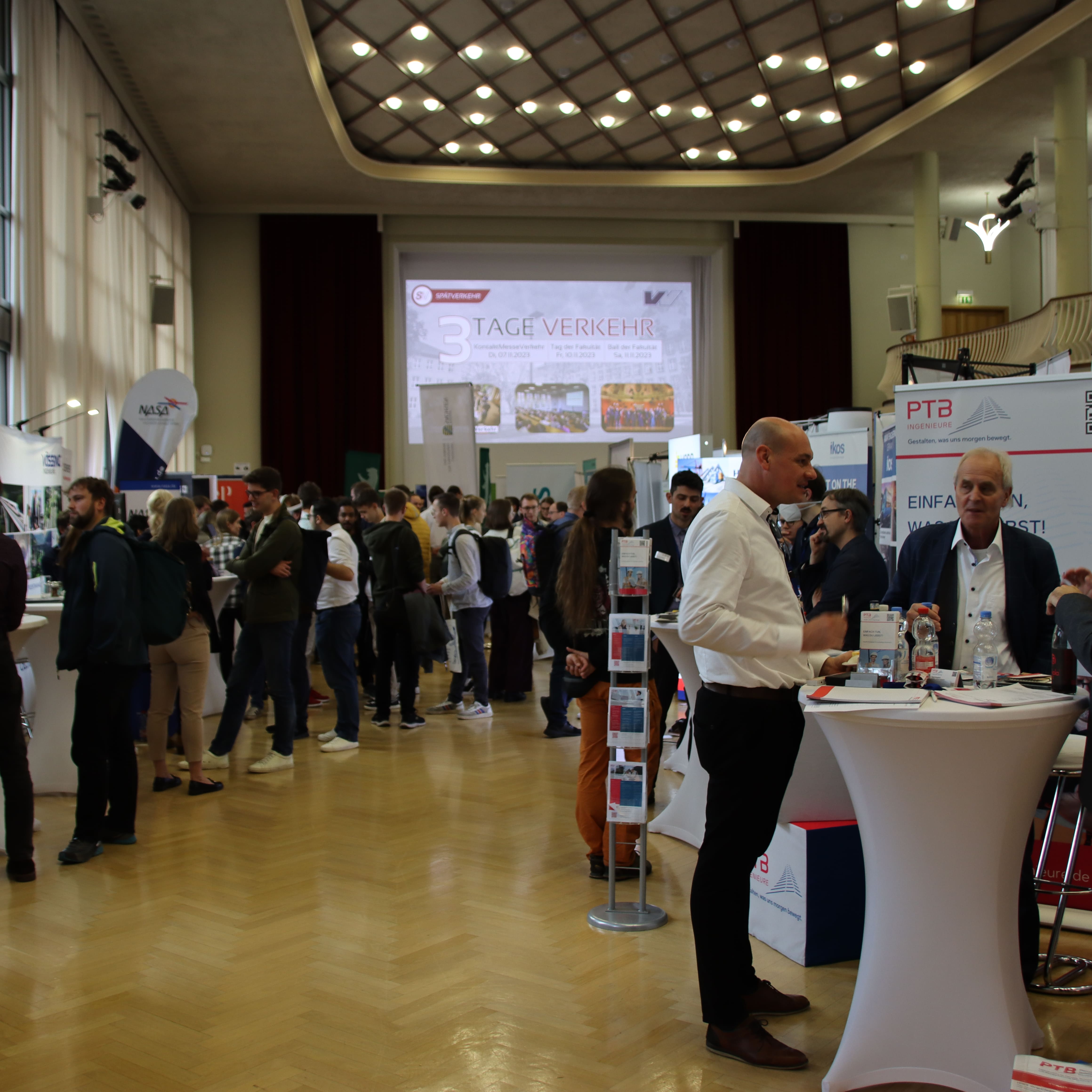 Seit mittlerweile mehr als 15 Jahren bietet die Messe jährlich vielen Unternehmen aus den Bereichen Verkehr, Transport und Mobilität eine gern genutzte Plattform, um sich Studierenden der Fakultät und angrenzender Fachgebiete wie Maschinenbau oder Elektrotechnik vorzustellen und zukünftige Nachwuchstalente für sich zu gewinnen. In diesem Jahr stand das Organisationsteam vom Alumniverein der Fakultät, „Spätverkehr“, vor einer neuen Herausforderung: Erstmals fand die Messe nicht im Gerhart-Potthoff-Bau, sondern im Dülfersaal der TU Dresden statt. Der erlaubte eine andere Standverteilung, was zu einem Ausstellerrekord von 47 Unternehmen führte. Das Verkehrslage-Redaktionsteam hat sich auch in diesem Jahr umgehört und die Stimmen einiger ausstellender Firmen bzw. Firmenvertreter:innen eingesammelt.