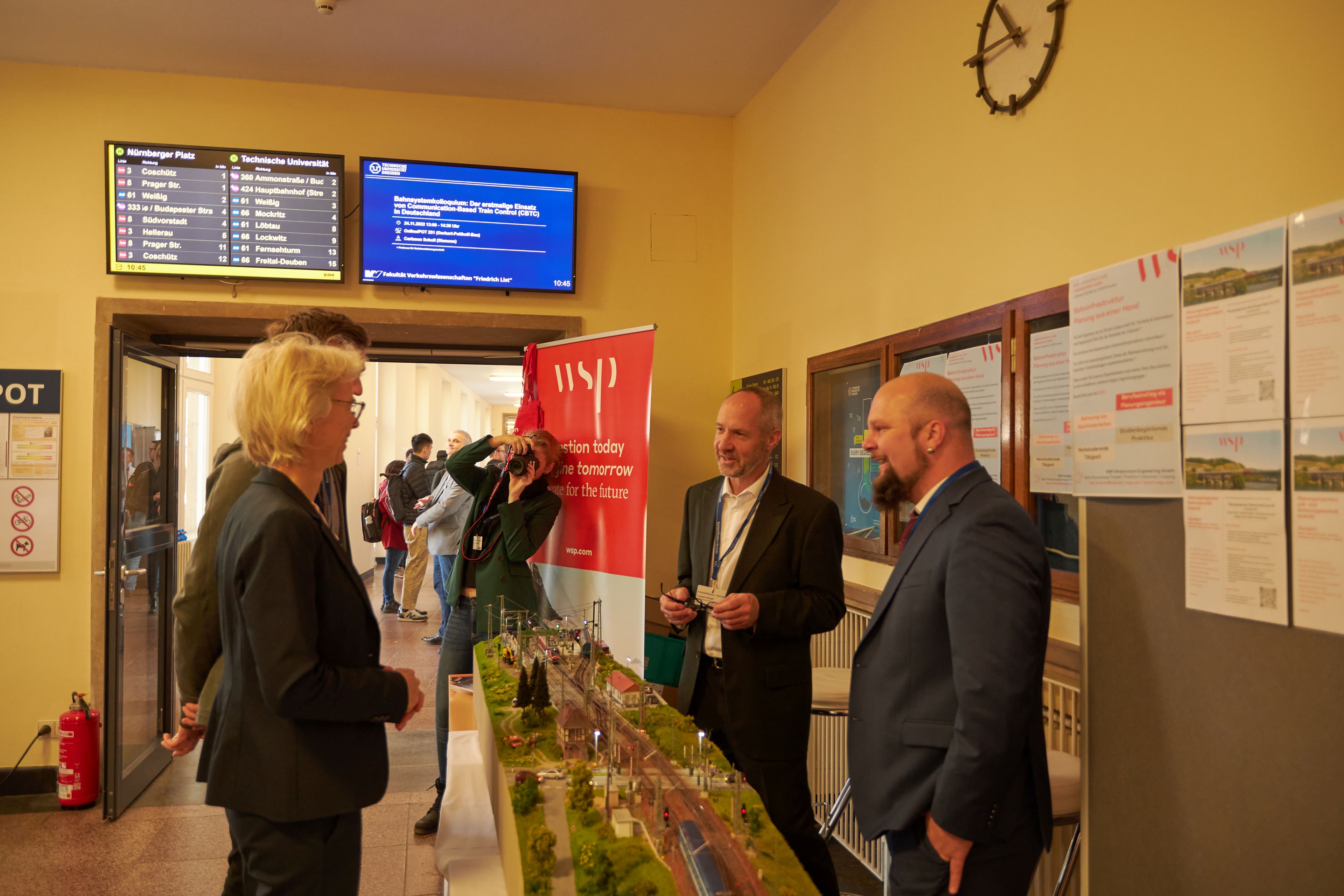 Die Repräsentant:innen Hernandez, Fuchs und Kurtzke von der WSP Infrastructure Engineering GmbH präsentierten Eisenbahnmodelle für interessierte Studierende, die einen „Willen und Leidenschaft für die Bahn“ besitzen. Es ginge auf der Messe vor allem ums Studierendenrekruting. Auch im Angebot: Praktikumsstellen, Abschlussarbeiten und sogar Folgeanstellungen für Absolvent:innen. WSP ist seit elf Jahren jährlich auf der KontaktMesse Verkehr präsent, zu Beginn noch unter anderem Namen (IVV Ingenieurgesellschaft für Verkehrsplanung und Verkehrssicherung GmbH (IVV GmbH)). Die Messe sei für die WPS von zentraler Bedeutung, da dort ein Erstkontakt zu den Studierenden hergestellt und konkrete Berufsvorstellungen (Tätigkeit, berufliche Anforderungen und Profil) vermittelt würden. Bei WPS arbeiten bereits zwei Absolvent:innen der Verkehrswissenschaften.
