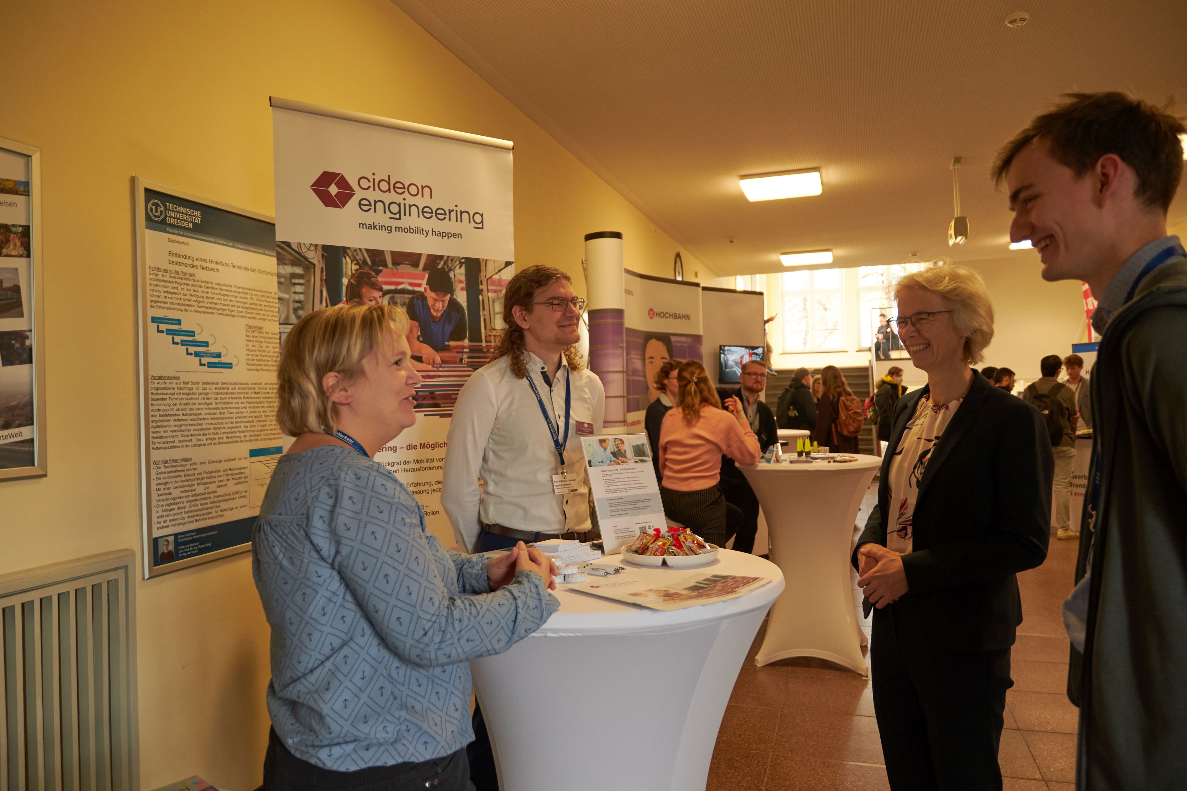 Nancy Müller und Noch-Student der Fakultät Leonard Trommler von der CE cideon engineering GmbH & Co. KG nutzten die Messe für die Öffentlichkeitsarbeit für ihr Unternehmen. Die Fakultät sei ein zentraler und spezieller Anknüpfungspunkt, möglichen Nachwuchs für das Bahnwesen zu finden. Dafür gebe es nicht viele Anbieter. Das Unternehmen war zum zweiten Mal auf der Messe vertreten und hat sich bereits für das kommende Jahr angemeldet. Leonard Trommler ist aktuell Werkstudent bei CE cideon engineering. Zunächst arbeitete er im Rahmen einer 2020 ausgeschriebenen unterstützenden Projektstelle zur Restauration eines Triebzuges. Die Einstellung erfolgte im August 2021 inklusive eines viermonatigen Pflichtpraktikums. Inzwischen ist Trommler über das Projekt hinaus vollständig betrieblich eingebunden. Seine Diplomarbeit plant er firmenintern zu schreiben.