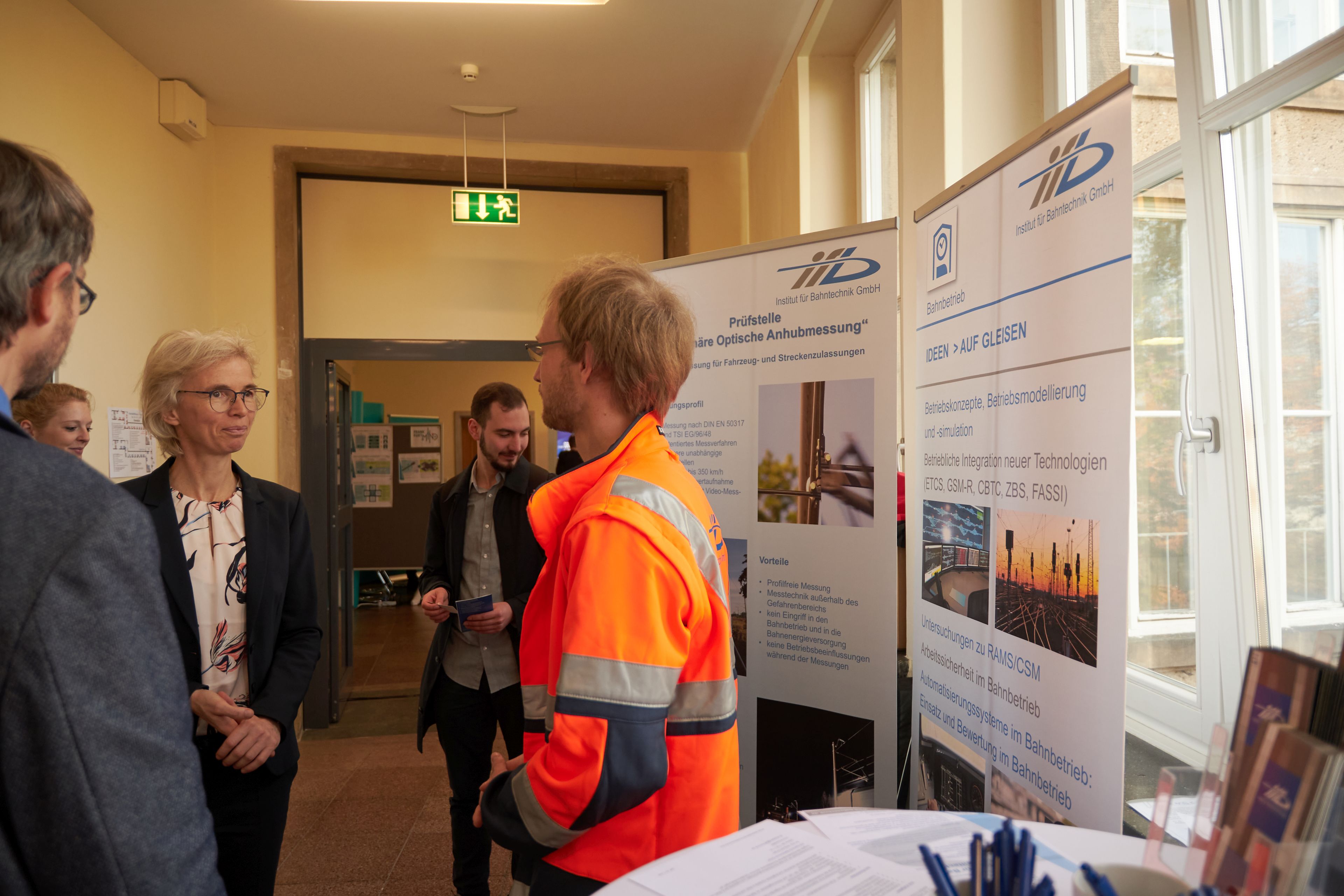 Das Dresdner Institut für Bahntechnik (IfB) möchte auf der Messe vor allem das studentische Wissen um die Firma schärfen. Sich zu präsentieren sei wichtig, um nach zukünftigen Mitarbeitenden zu suchen sowie auf studentischer Seite einen Vorstellungsabgleich bzgl. möglicher Tätigkeitsfelder in der Bahntechnik vorzunehmen und so praktische Beispiele mit an die Hand zu geben. Durch Prof. Dr.-Ing. Arnd Stephan bestünde ein enger Bezug zur Fakultät und zur Professur für Elektrische Bahnen. Vertreten ist das Institut schon seit dem ersten Messejahr. Die Bedeutung dieser sei nach wie vor hoch, da es vor allem um Sichtbarkeit für die Studierenden und Networking ginge. Alumni der Fakultät starteten in den vergangenen Jahren beim IfB als Praktikanten und seien nun fest angestellt.