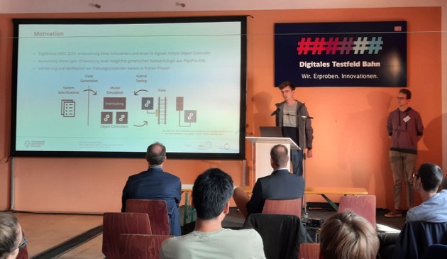Die Vorträge innerhalb der Labor- und Demophase fanden auf dem Digital Rail Campus in Jöhstadt statt, unweit des Digitalen Testfelds Bahn. Hier präsentierten Studierende der TU Dresden ihren Beitrag zum Projekt "EULYNX-Life". Dabei geht es darum, aus einer PlanPro-Datei eine einfache Stellwerkslogik zu erzeugen.