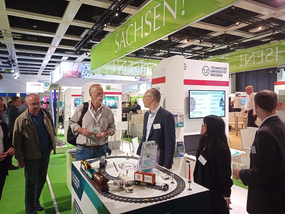 The Chair of Electric Railways, the Chair of Railway Track Engineering, the Chair of Railway Signalling and Transport Safety Technology and the Chair of Railway Operations as well as the Railway Operation Laboratory provided insights into current research projects and presented the degree programs offered by the Faculty of Transport and Traffic Sciences. Numerous partners from research and industry came to talk to the participating employees at the stand and were able to experience a virtual tour of the railroad operations laboratory in Dresden using VR glasses, among other things. As part of the “Train your Brain” campaign for young talent, which the Faculty of Transport and Traffic Sciences is implementing together with the German Railway Industry Association (VDB) and RailS., the Saxon railroad technology network, a school class from a Dresden community school also visited the faculty's presentation stand. The trade fair appearance also served as an exchange and networking platform for graduates of the faculty and received a great and positive response overall.