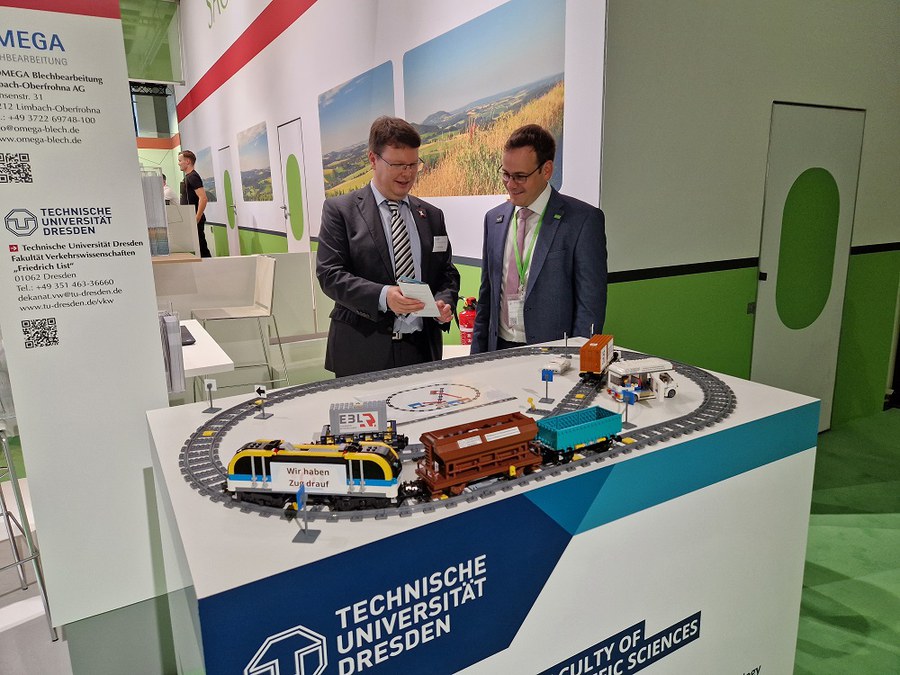 A Lego train with a “shunting game” attracted young and old railroad enthusiasts to the exhibition stand of the railroad professorships of the Faculty of Transport Sciences “Friedrich List” at TU Dresden.