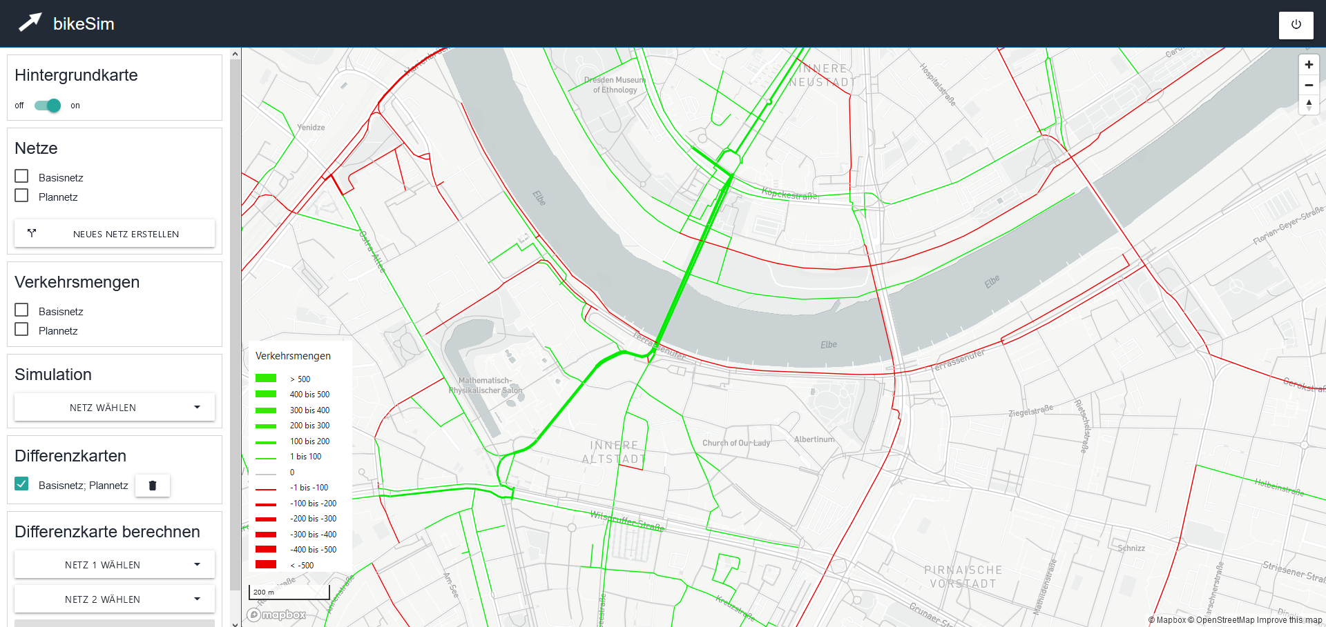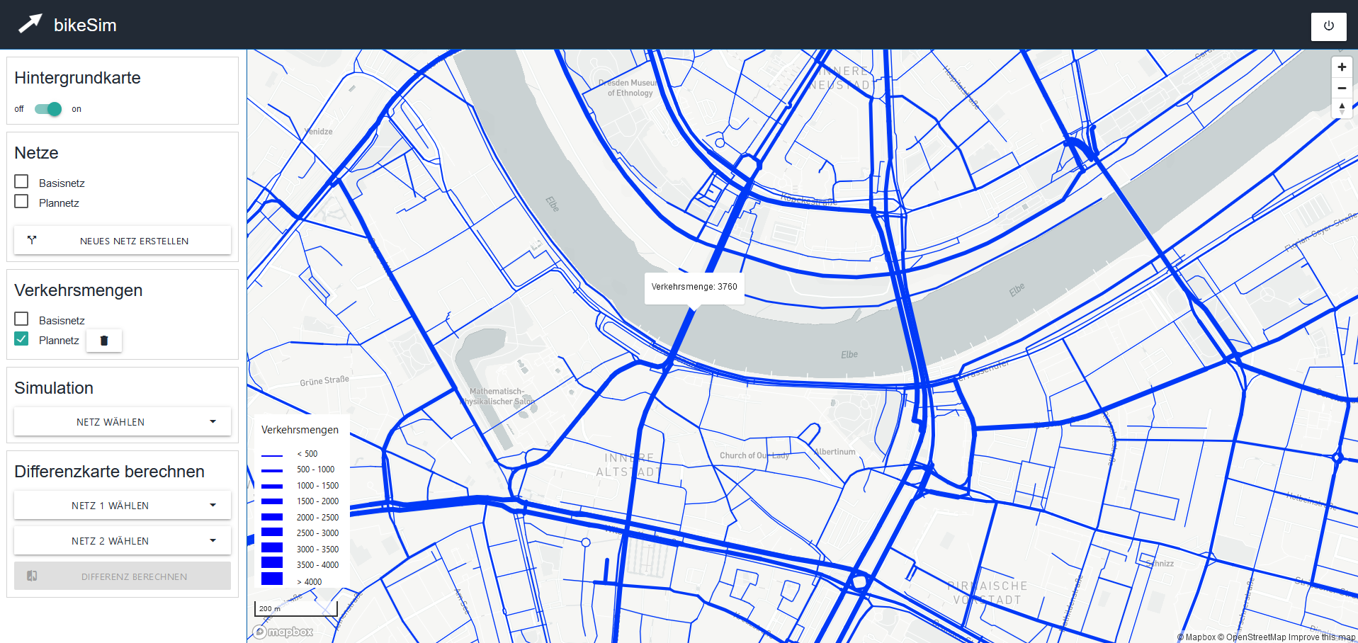 This is where the web application "bikeSim" comes in. It allows municipalities to change the characteristics of route sections in the (bicycle) traffic network for a plan case and simulate the use of bicycle lanes in their (bicycle) traffic network. From this, conclusions can be drawn for the redesign and further development of the cycling network. The application is based on GPS route data and open geo and traffic data (Open Data). The web application was initially developed as a prototype for the city of Dresden as part of a feasibility study.