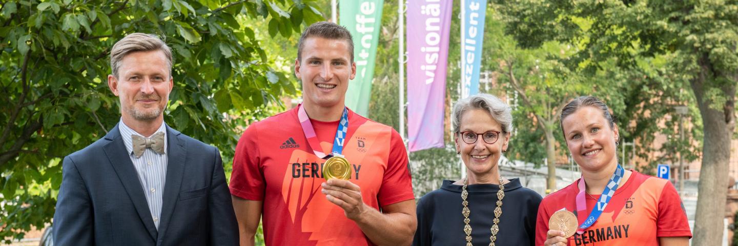 Rector Prof. Ursula M. Staudinger and Chancellor Dr. Andreas Handschuh gave a warm welcome to the Olympians on their behalf: "You both are showing that you can be very successful in sports as well as in your studies. We are very happy about your success."As a small gift, Tina Punzel (Olympic bronze medal in synchronised diving and student of economics) and Tom Liebscher received TUD backpacks filled with many useful little things.